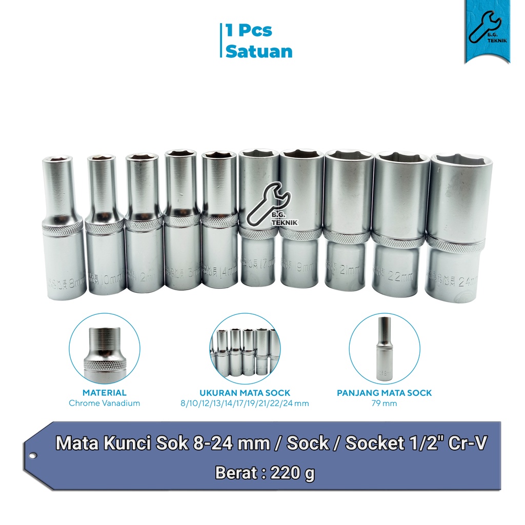 Mata Kunci Sok 8-24 mm / Sock / Socket 1/2" Cr-V [Silver Panjang]