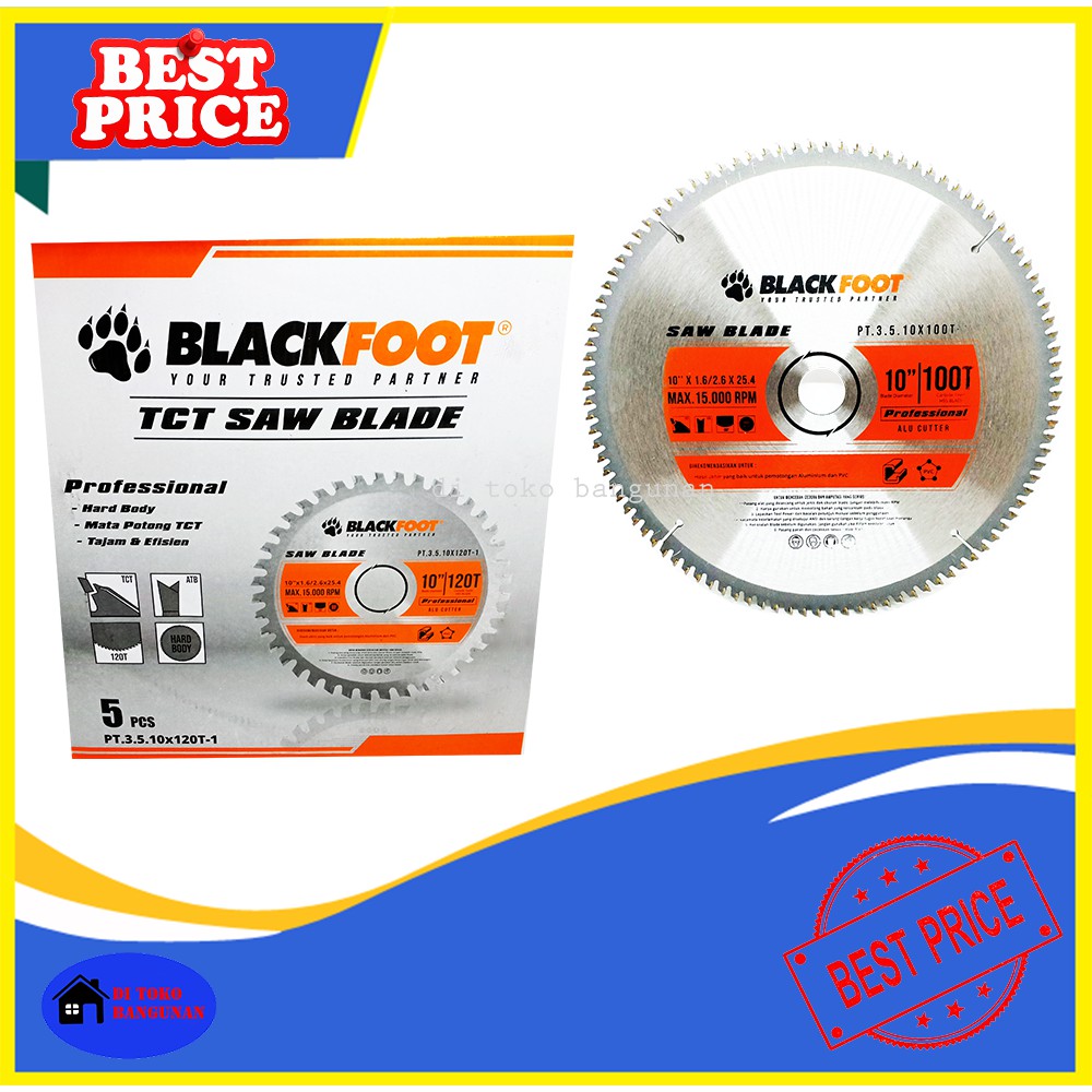 Spek : Merk : BLACKFOOT Bahan : HIGH QUALITY Ukuran : 10 INCH Type : - TCT 60T - TCT 100T - TCT 120T Kegunaan : Mata Potong Kayu