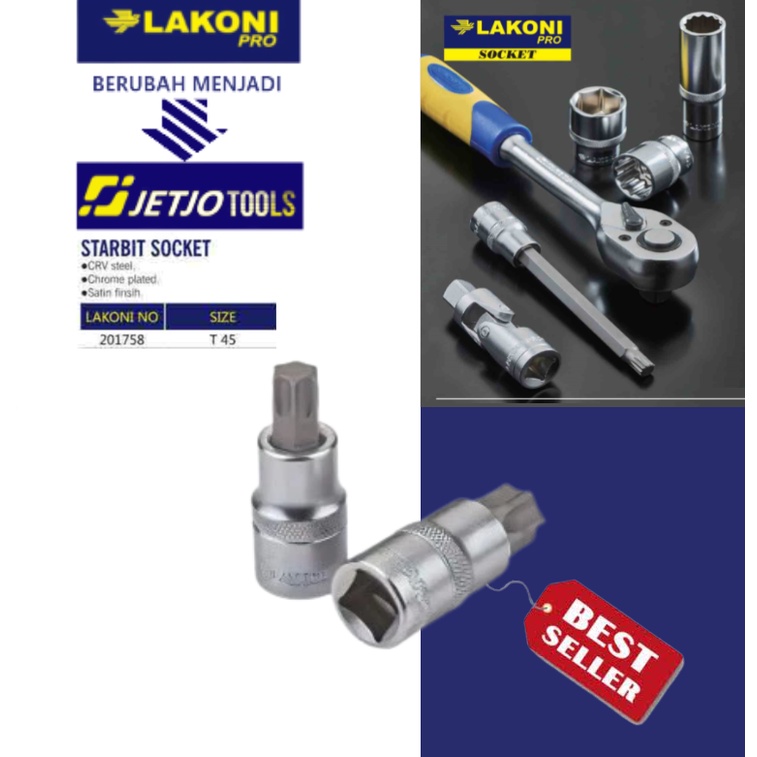STARBIT SOCKET T 45 Square 1/2" LAKONI PRO / JETJO TOOLS (Merk LAKONI PRO sudah berganti nama menjadi JETJO TOOLS) Order # 201758 *CRV steel. *Chrome plated. *Satin finish.