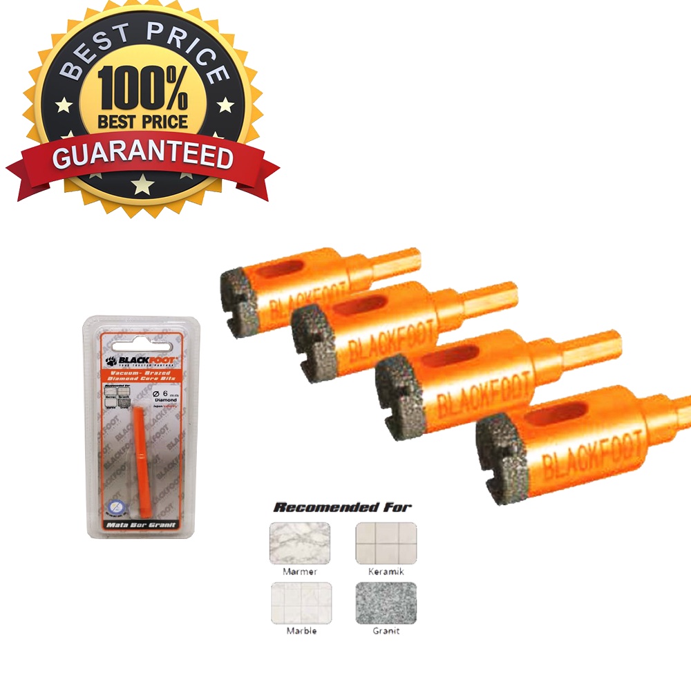 Deskripsi Matabor Granit / Mata Bor Granit 6mm BLACKFOOT Deskripsi Matabor Granit / Mata Bor Granit tersedia ukuran 6mm, 8mm, 10mm, 12mm, BLACKFOOT Vacum - Brazed Diamond Core Bits 6mm, 8mm, 10mm, 12mm, ( Mata Bor Granit 6mm, 8mm, 10mm, 12mm, - Carbon Stell Material - Chrome Finishing - Pemotongan Cepat Tajam & Potongan Halus - Dengan Kecepatan Rendah Setara Kecepatan Tinggi