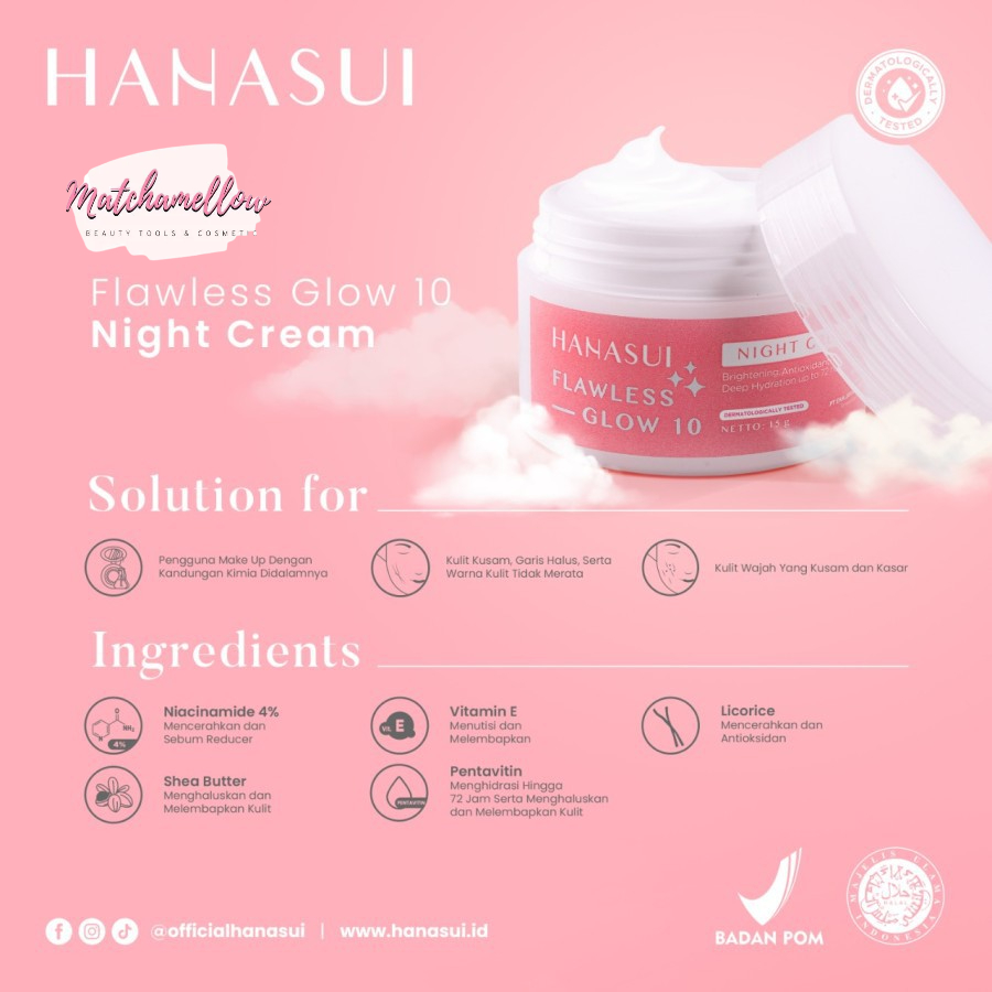 Hanasui Flawless Glow 10 kini hadir untuk menjadi solusi para wanita Indonesia yang ingin melakukan perawatan wajah namun dengan biaya yang terjangkau. Hanasui Flawless Glow 10 Memiliki 4 rangkaian yaitu, Facial Wash, Essence, Day Cream dan Night Cream.