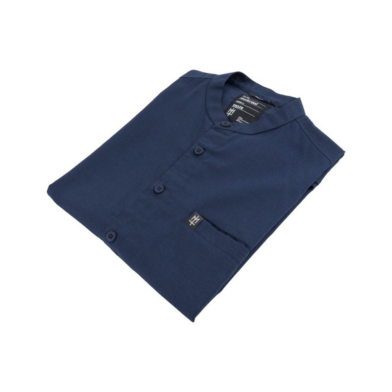 Navy cotton short sleeves button-ups shirt with black plastic buttons and satin label.