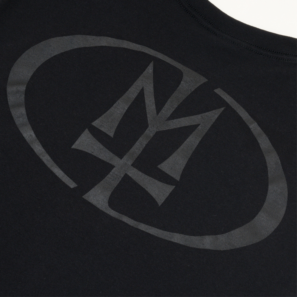 Black 20s cotton long sleeve T-shirts, open-end yarn, 100% cotton, tubular fit, seamless double needle 2cm collar, taped neck and shoulders, satin & cotton label, rib cuffs, double needle bottom hem, black plastisol ink screen print.
