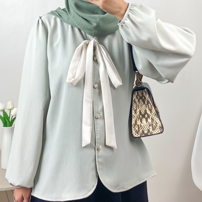 baju dengan bahan snowsheer tekstur crinkle yang nyaman, flowy dan elegan, dilengkapi dengan pita dan kancing vintage. cocok untuk kuliah, kerja maupun berpergian