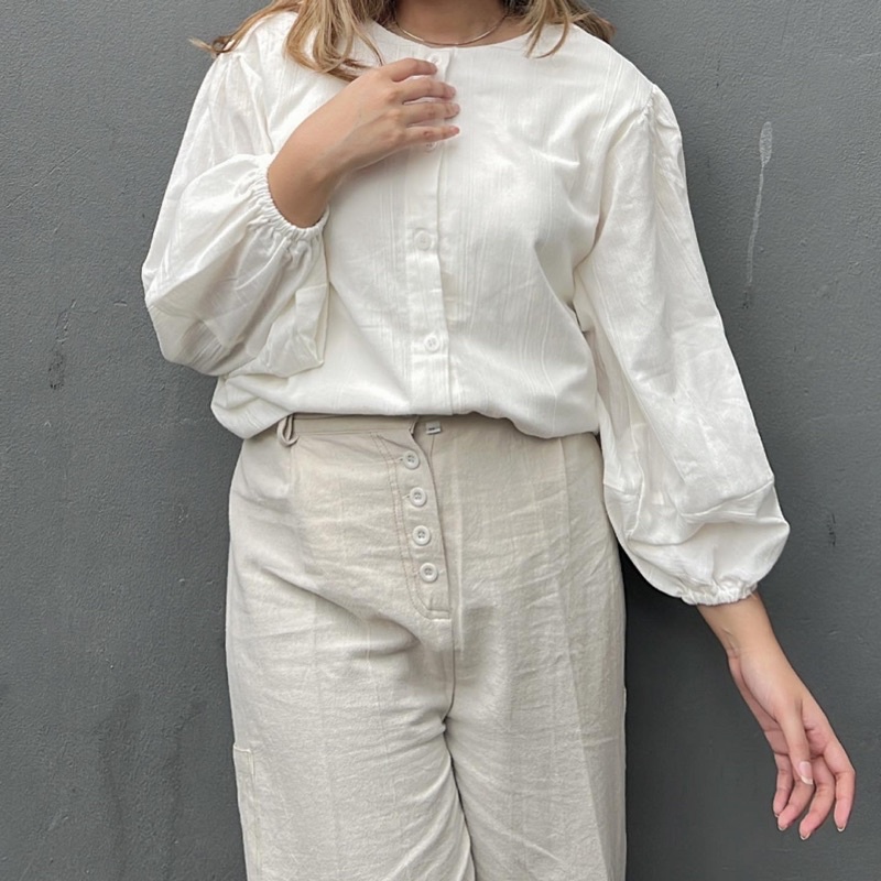 Maura menggunakan bahan cringkle linen dengan texture guratan pada permukaannya. Kancing aktif dengan model balon dilengannya.