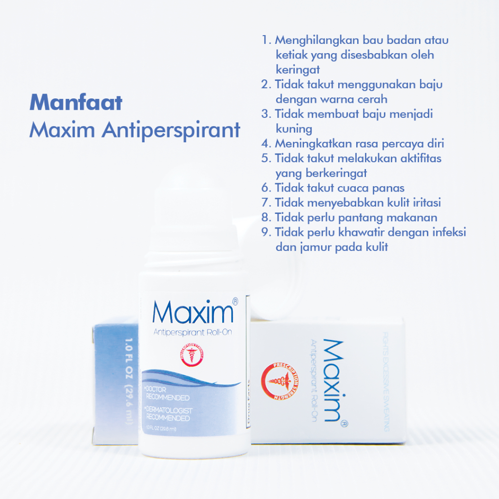Kelebihan Maxim: - Tidak Berbau dan Berwarna - Mengurangi dan Menghentikan Keringat Berlebih - Efektif pada daerah Ketiak - Hasil yang cepat terlihat sejak pertama kali pemakaian - 100% Aman Kandungan Aktif - Non Alkohol - Non Paraben - Sudah BPOM