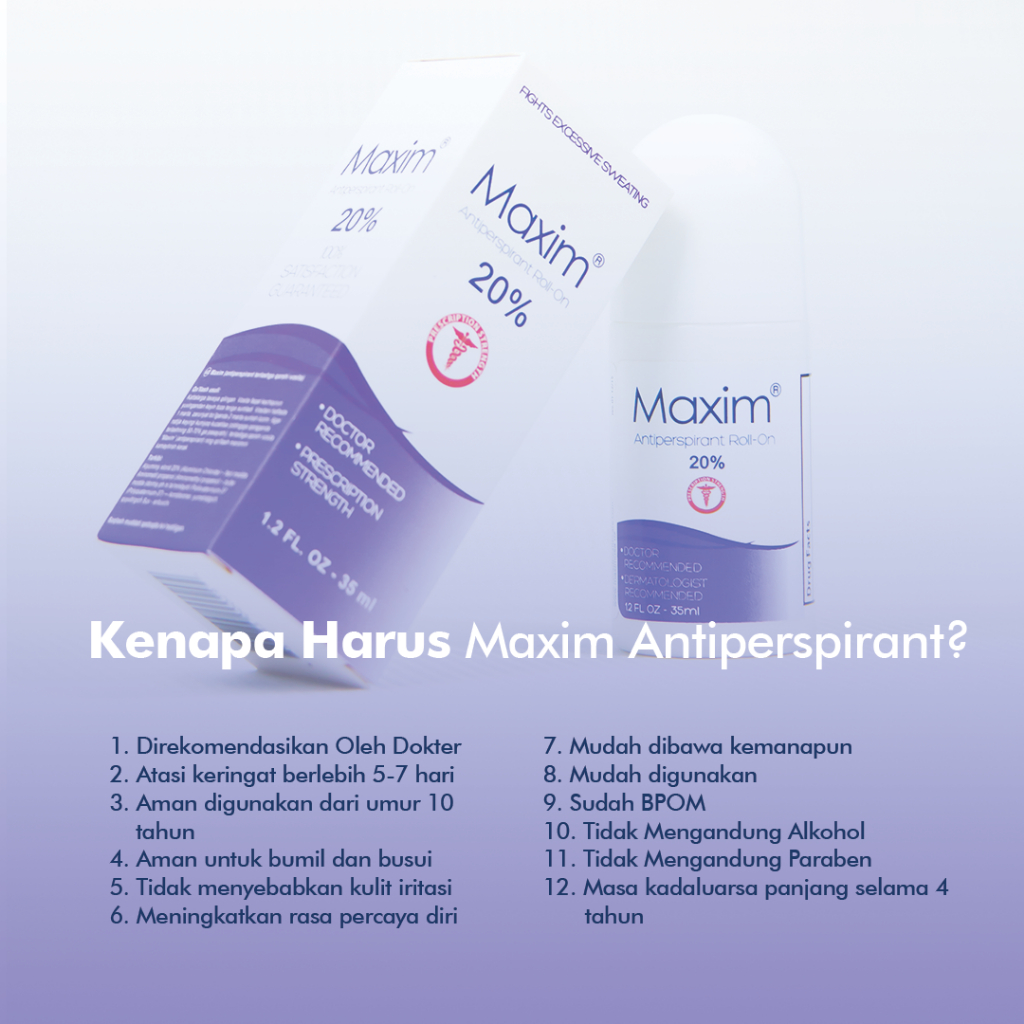 Berkeringat berlebih atau Hyperhidrosis adalah kondisi yang dialami oleh jutaan orang diseluruh dunia. Kondisi ini dapat menimbulkan berbagai dampak pada penderitanya terutama psikologis dan sosial. Namun banyak dari orang tersebut yang belum menemukan solusi atas permasalahan tersebut. Maka Maxim hadir dengan formula khusus yang dapat mengurangi dan menghentikan keringat berlebih.