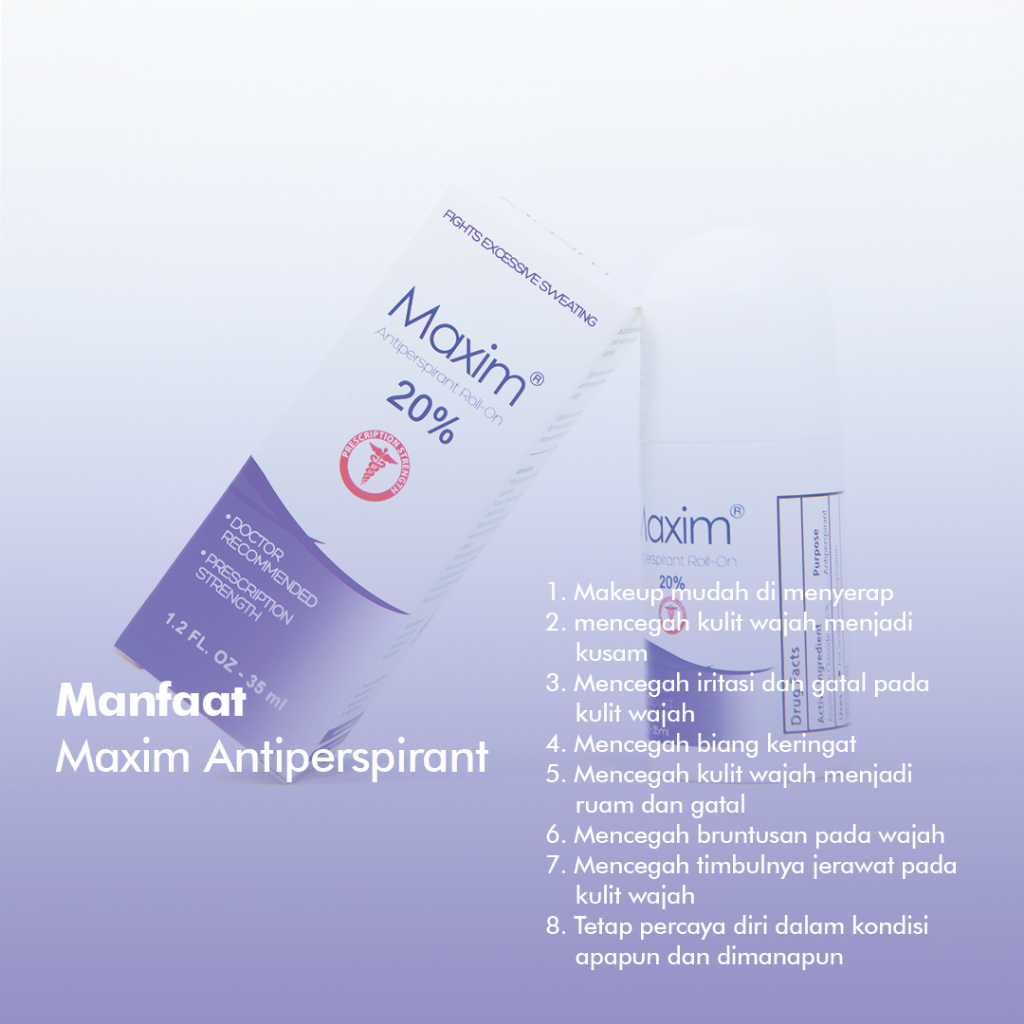 Maxim Antiperspirant 20% hadir dalam kemasan 35ml solusi untuk penderita Hyperhidrosis untuk mengatasi keringat berlebih pada area WAJAH dan SEKITAR LEHER.