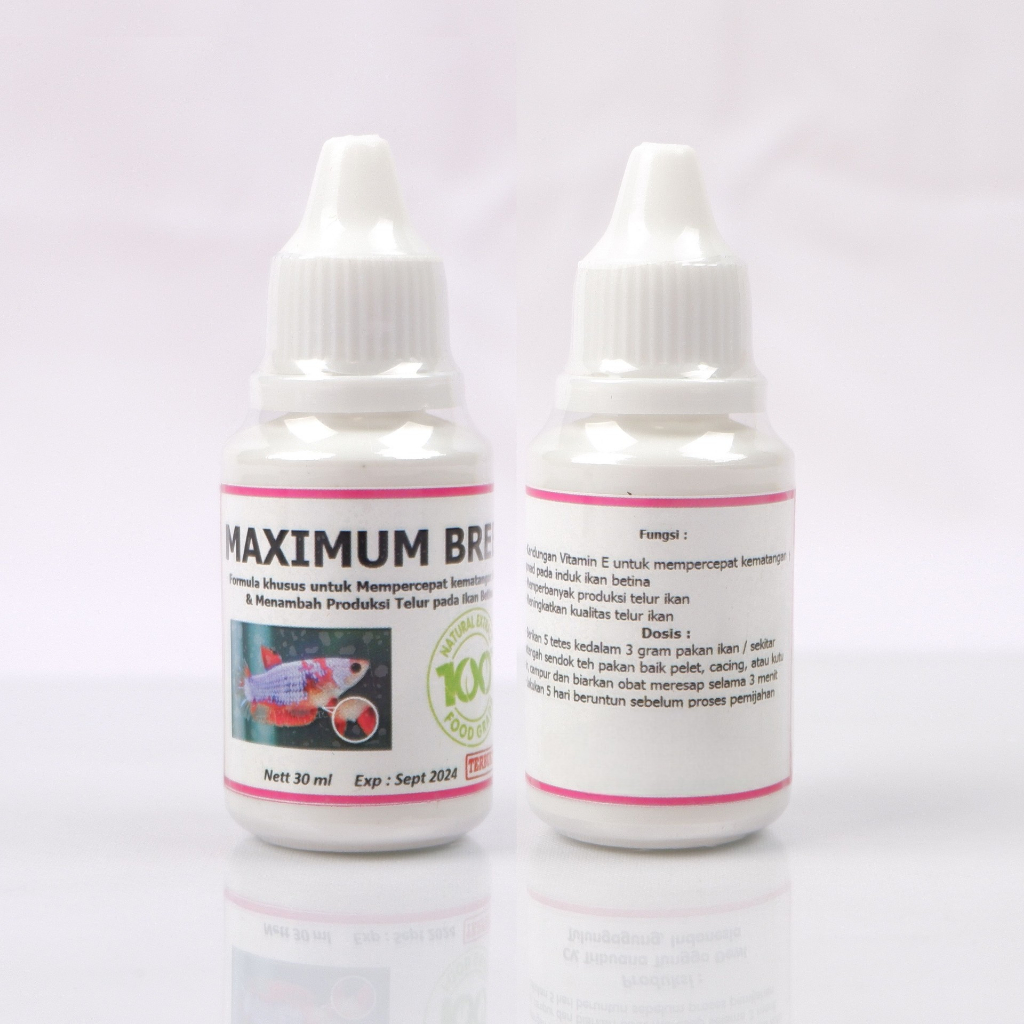 # Aturan pakai : - Berikan 5 tetes Maximum Breed pada 3 gram / setengah sendok teh pakan ikan sesuai kebiasaan baik pelet , Kutu air , maupun Cacing Sutra Lalu aduk sampai bercampur dan biarkan obat meresap pada pakan ikan selama 3 menit - Lakukan cara diatas selama 5 hari beruntun sebelum proses pemijahan dilakukan
