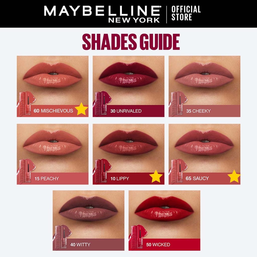 Tint kini dalam teknologi Superstay Lip paling transferproof & tahan lama dengan Vinyl Finish Cara pakai: 1. SHAKE = Kocok kemasan minimal 5 detik 2. SWIPE = Aplikasikan dan diamkan hinga benar-benar kering 3. 16 JAM PIGMENTED = Vinyl look yang trendy tanpa transfer Packaging: Mewah dengan emboss dan warna sesuai shade, aplikator ramping yang memudahkan pengaplikasian Pilihan Warna dengan color-lock formula: 10 LIPPY - Brownish Nude Red 15 PEACHY - Light Nude Coral 30 UNRIVALED - Deep Berry Pink 35 CHEEKY - Light Nude Pink 40 WITTY - Mauve Pink 50 WICKED - Red 60 MISCHIEVOUS - Nude Coral 65 SAUCY - Nude Brownish Pink