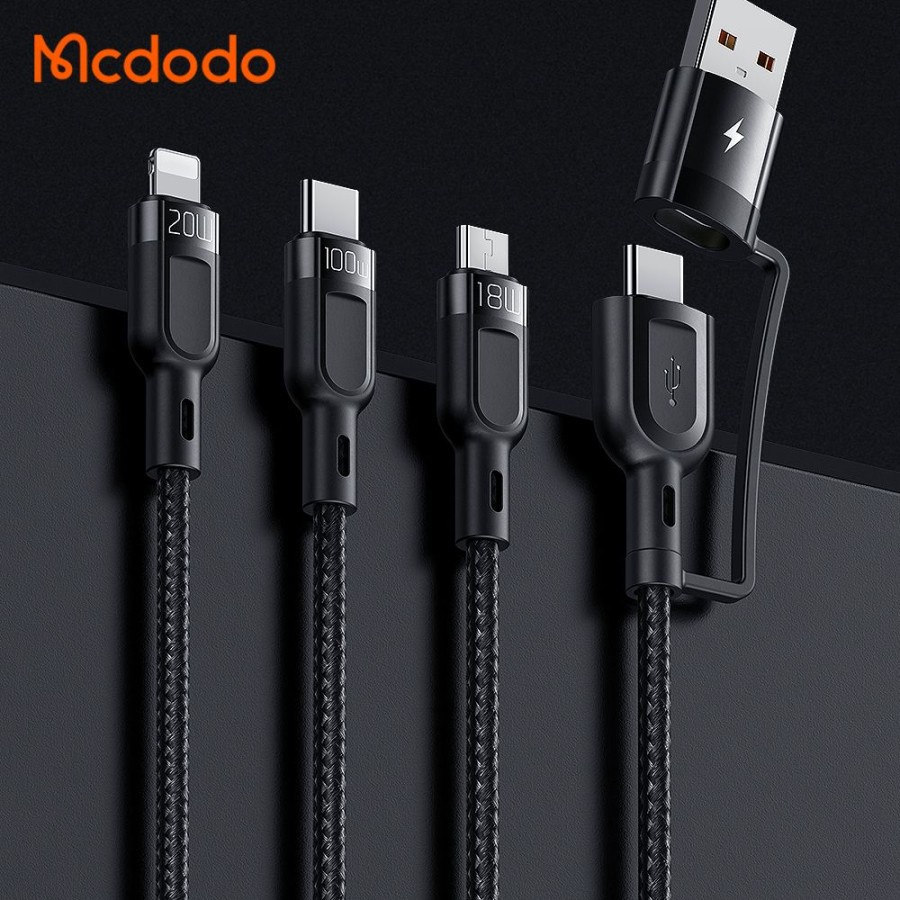 Deskripsi : - Merek : MCDODO - Model : CA-880 - Material : Nylon Braided+TPE - Interface : USB A + Type C - Output : Type C + Lighting + Micro USB - Power : 100W - Color : Black - Length : 1.2M - Function : Charging ,Data Transmiss