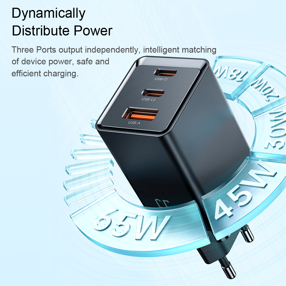 Spesifikasi : - Model : Ch-1540 - Input : 100-240V~50/60Hz 1.5A - Material : Fireproof PC - Type-C1 output : 5V-3A, 9V-3A, 12V-3A, 15V-3A, 20V-3.35A (67W Max) - Type-C2 output : 5V-3A, 9V-3A, 12V-3A, 15V-3A, 20V-3.35A (67W Max) - USB A output : 4.5V-5A, 5V-4.5A, 9V-2A, 12V-1.5A (22.5W Max) - Type-C1+Type-C2 output : 45W+20W (65W) - Type-C1+USB output : 45W+18W (63W) - Type-C2+USB output : 5V-3.6A - Type-C1+Type-C2+USB total output: 45W+18W (63W Max) - Total Output : 67W Max - Weight : 95.3gr - Dimension : 32 x 37.1 x 95.4mm