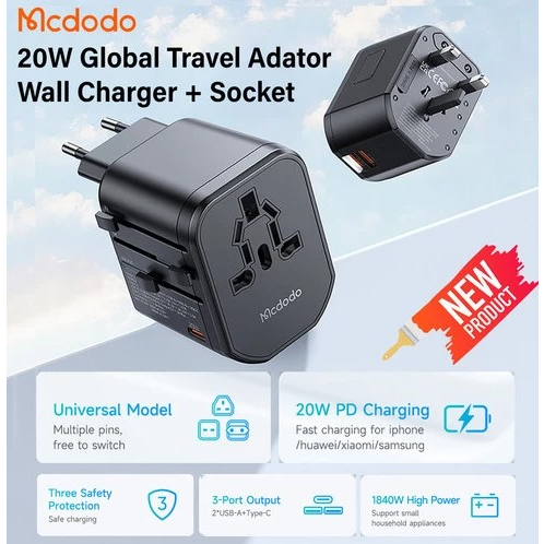 Handphone & Aksesoris > Kabel, Charger, & Konverter > Travel Adaptor > Mcdodo Mini Adaptor Travel Universal CP-3471 Traveling Kepala Charger Handphone Adapter USB + Type C 20W EU UK US