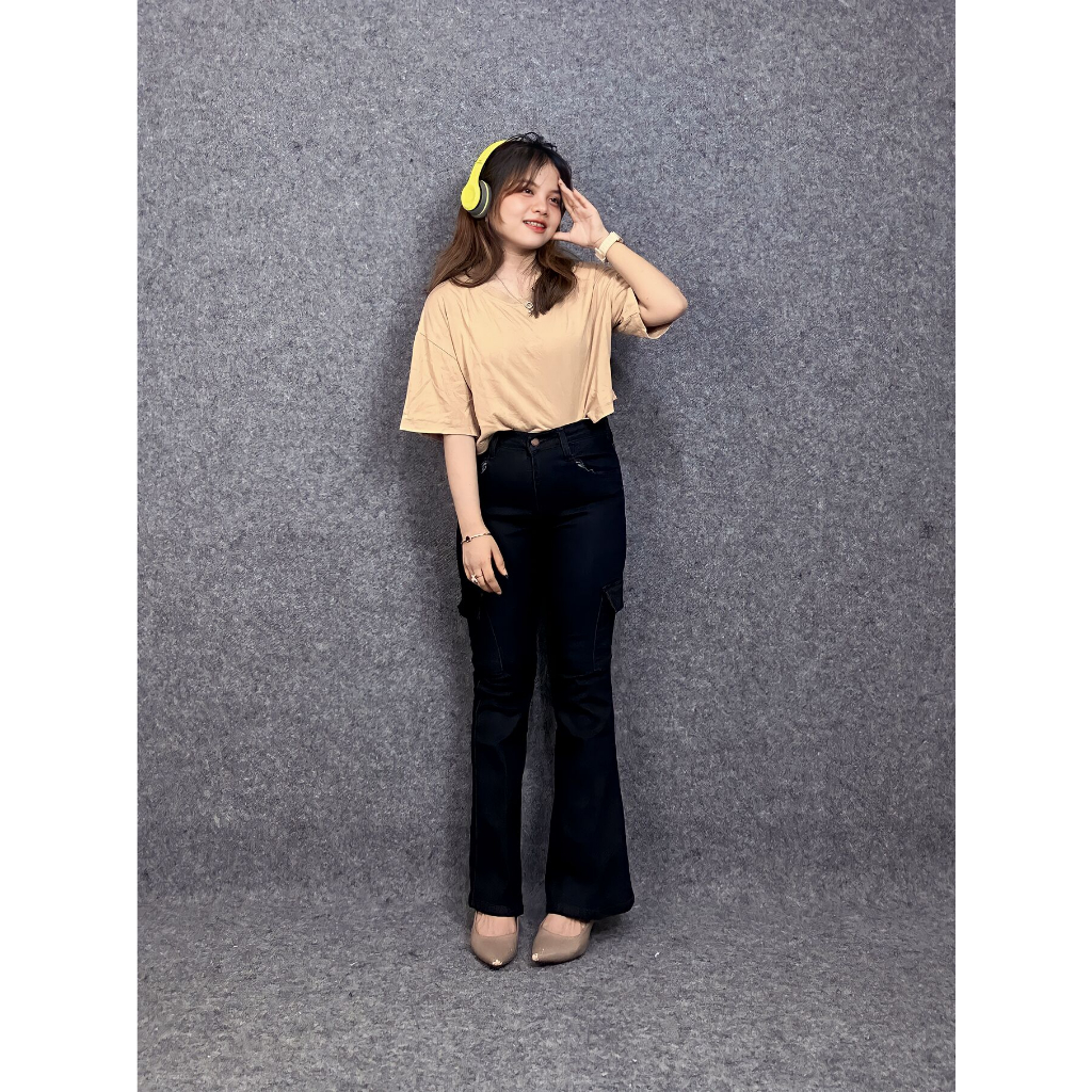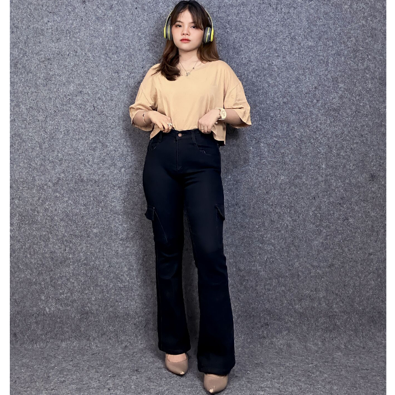 Detail MCO - Celana Jeans Wanita - Cutbray Kargo Black Kasual Denim Panjang Kecil Jumbo Street style