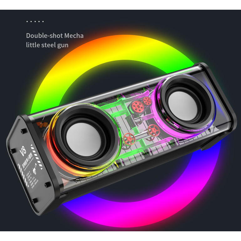 Detail Mecha speaker bluetooth meriam baja kecil transparan audio portabel nirkabel 10w mecha subwoofer warna-warni