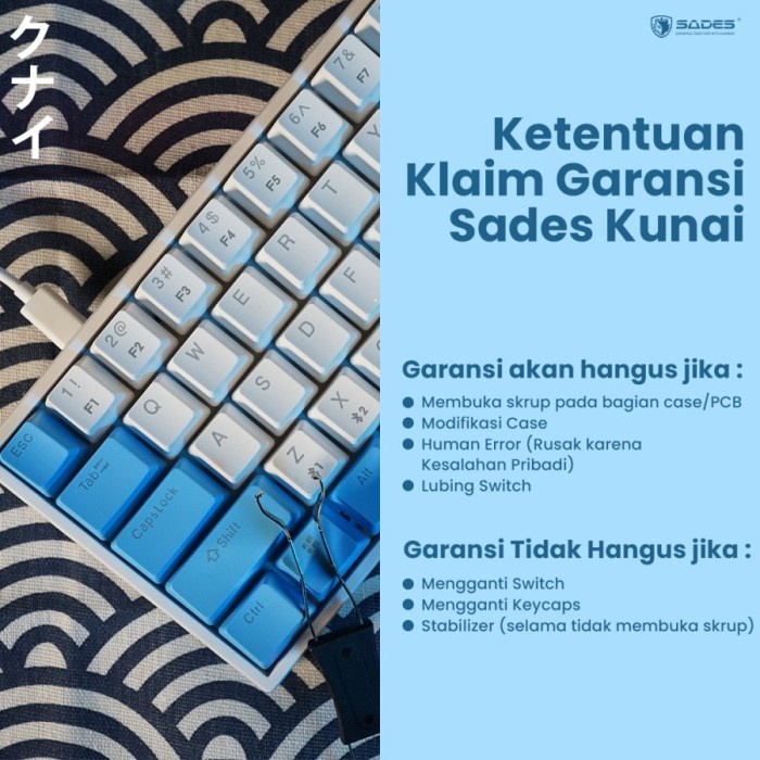SADES KUNAI 3 in 1 Connection (2.4GHz Wireless / Bluetooth / Wired) with Switch Mode merupakan keyboard dengan koneksi 3 in 1 yang dapat di gunakan berbagai macam device sehingga kamu bisa leluasa menggunakanya. Sades Kunai tersedia dengan 1 pilihan switch Gateron Yellow dan 3 pilihan warna keycapnya yaitu Grey White, White Grey, dan White Blue