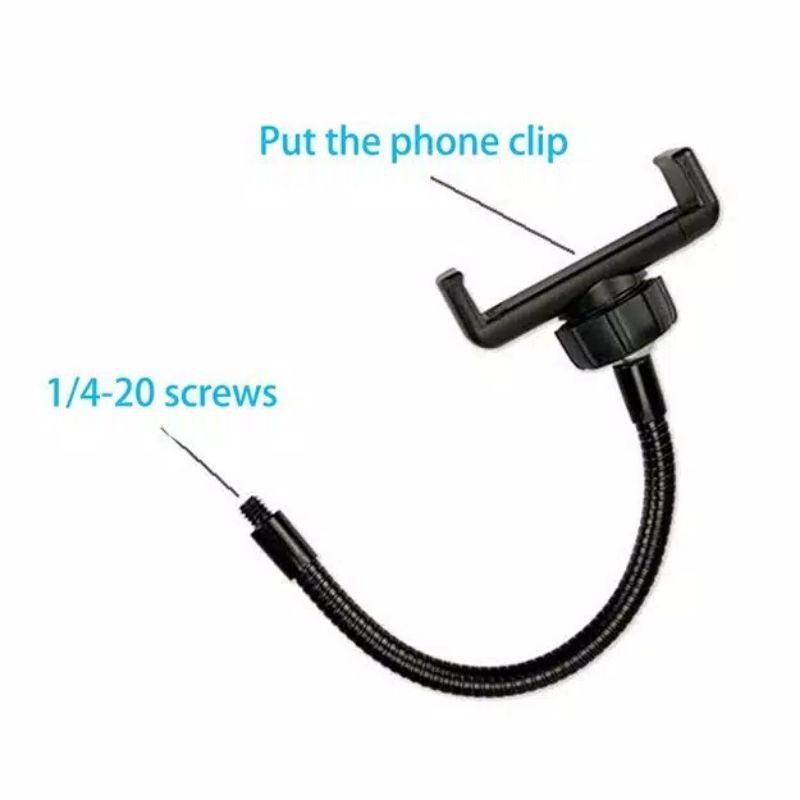 Spesifikasi : Model : Hose Bracket for Ring Light Type : Gooseneck Clamp 360 Degree With Phone Holder 6-9CM 1/4 Gooseneck Tube with Phone Clip Suitable for : 3.5-6.5inch cellphones Package : 1*hose + 1*clamp Phone mount expanding range : 65-95mm Gooseneck hose length : 12.5cm/4.93inch Weight : 77g Feature : Connect with 1/4 female screw hole and easy to adjust angle