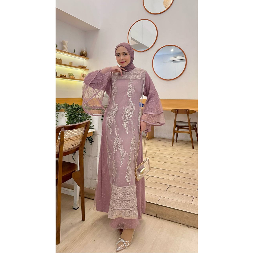 Bismillah, Adha Series dari hiladira READY TO ORDER medeline dress full brukat tule dot dan brukat depan premium perpaduan silk maxmara yg lembut dan memberi kesan mewah untuk dress ini, kainnya lembut nyaman ada talinya bisa 2 look tali diikat kedepan dan kebelakang aman untuk ld kecil sampai besar karena ada tali pengaturnya