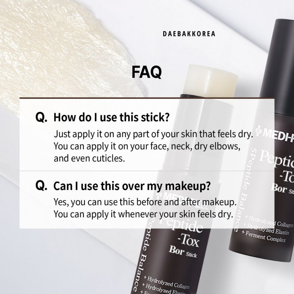 Medi-Peel Bor-Tox Peptide Wrinkle Stick Meningkatkan kekencangan, elastisitas dan kepadatan kulit, Menghaluskan dan mengencangkan Merangsang produksi kolagennya sendiri Mencegah munculnya kerutan dan mengurangi kedalaman yang ada satu. Mudah dan higienis untuk diaplikasikan, ideal bagi mereka yang tidak ingin menghabiskan banyak waktu untuk perawatan.