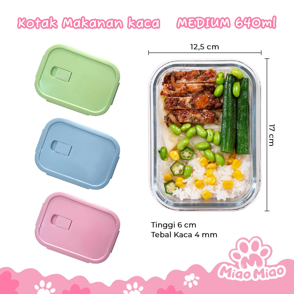 VARIAN MEDIUM 640ml BERAT BERSIH: 450gr - Bahan kaca tebal dapat dipanaskan di microwave & oven (Tahan panas hingga 200ºC ) - Dapat disimpan dalam kulkas dan freezer (Tahan dingin hingga -20ºC) - Segel ganda lock dan silikon menutup dengan erat anti bocor dan kedap udara. - Desain unik dengan 3 pilihan warna (BIRU, HIJAU, PINK). - Tersedia juga varian 2 kolom dan 3 kolom (Ukuran Large 1040ml). - Bahan kotak kaca dan tutup plastik PP berkualitas FOODGRADE (Aman untuk makanan). - Lobang udara pada tutup fungsi mempermudah buka tutup.