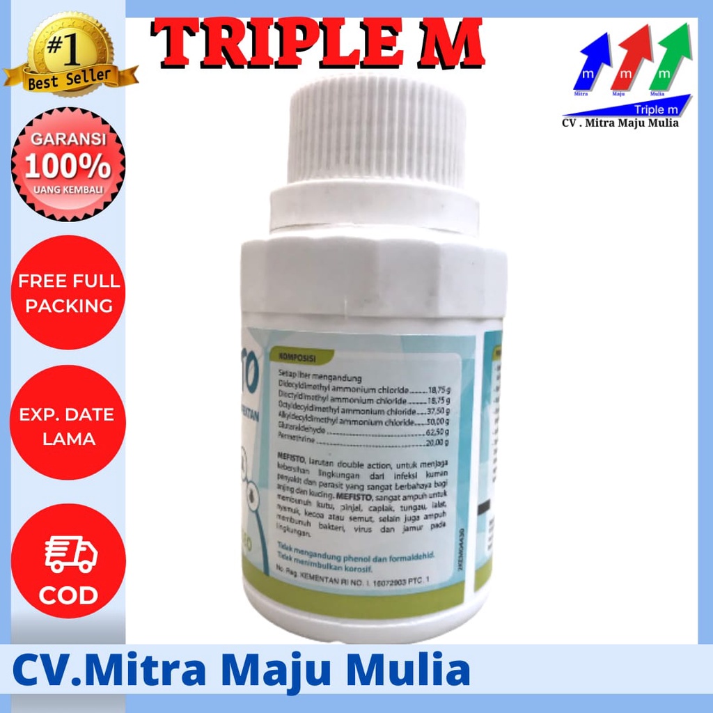MEFISTO adalah larutan dengan dua aksi untuk menjaga kebersihan lingkungan dari infeksi kuman penyakit dan parasit. Mefisto juga ampuh untuk membunuh kutu, pinjal, caplak, tungau, lalat, nyamuk, kecoa atau semut. MEFISTO itu juga ampuh membunuh bakteri, virus dan jamur pada lingkungan.
