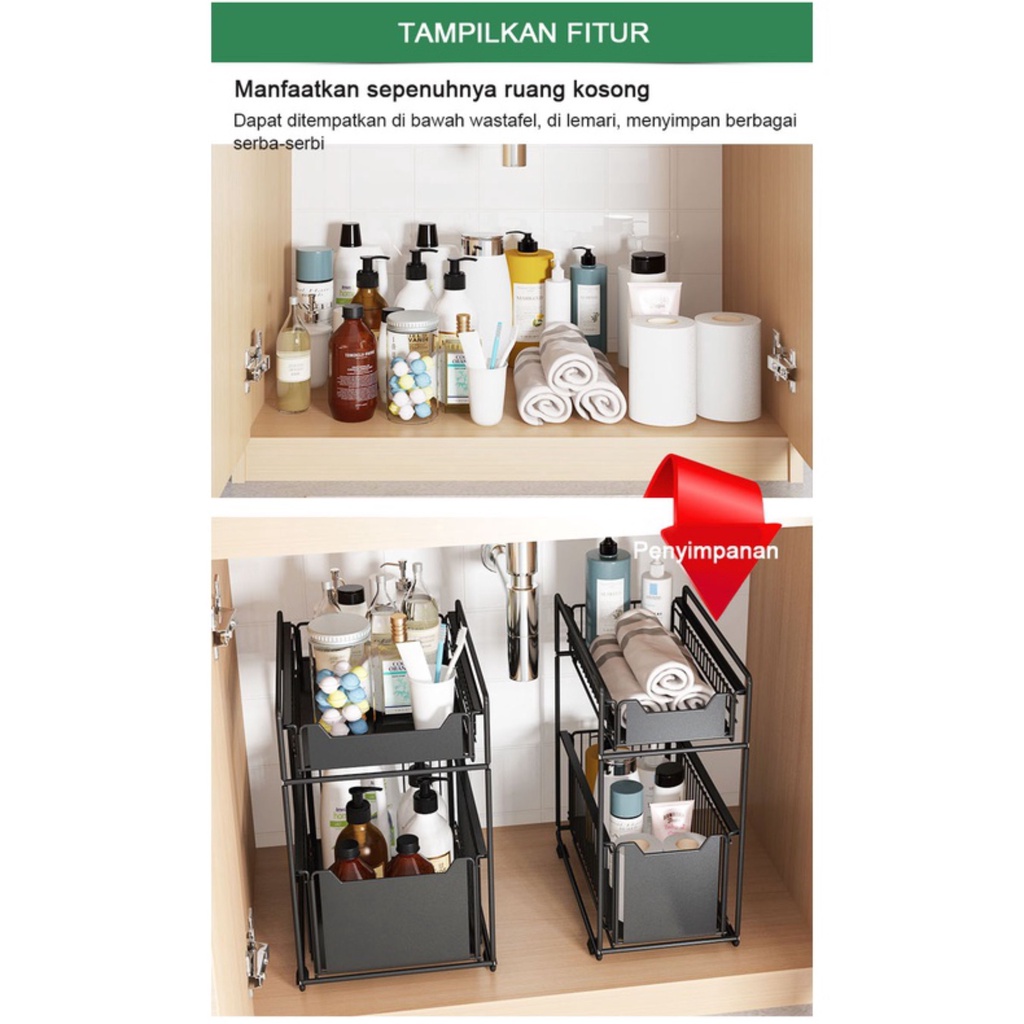 Penyimpanan Multifungsi, anti karat, anti korose, bisa membuat dapur menjadi rapi, dan muat banyak. Bahan Carbon Steel + Lapisan pelindung luar 2 Tingkat dan bisa di tarik keluar Railing yang tinggi mencegah item jatuh Bantalan kaki anti slip untuk mencegah rak tergelincir
