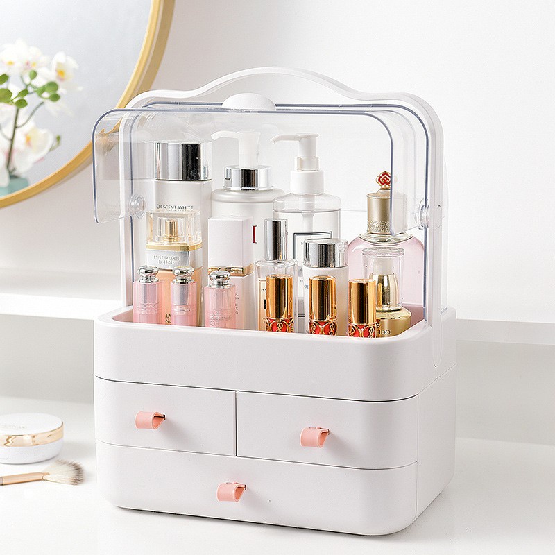 Rak kosmetik dari bahan Plastik PP yang ringan. kuat dan awet. Ada lacinya, juga ada sekat2 dan lemari untuk menyimpan berbagai macam keperluan kosmetik anda. Rak kosmetik berbahan transparan sehingga mempermudah mengambil produk makeup atau skincare kamu. Pada bagian atas juga terdapat cover untuk menutupi storage kamu dari debu-debu dan cipratan air. Dapat ditempatkan di meja rias, kamar mandi, ruang tidur dll
