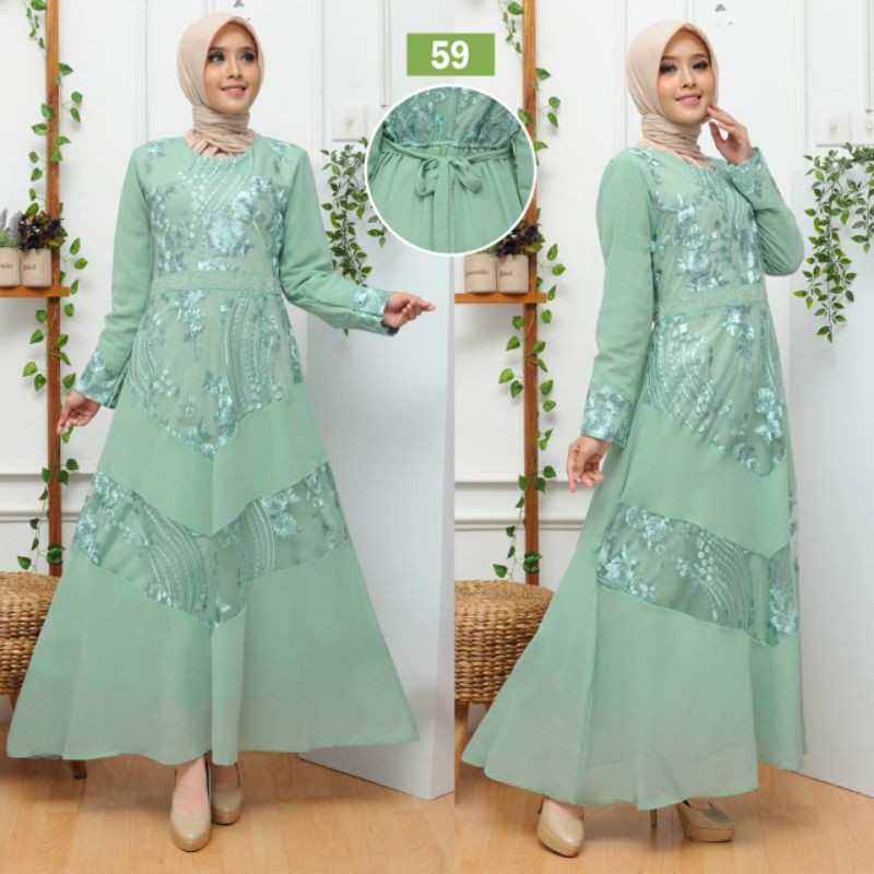 gamis pesta//gamis tille bordir,//kombinasi ceruti //lapisan dalaman hyget furing//tempelan mote//belakang seleting,,karet //tali pinggang LD 106 CM PJ 135 CM PT 58 CM ALLSIZE BISA BUAT UKURAN M,,L,,XL MUAT BB SAMPAI 70 KG