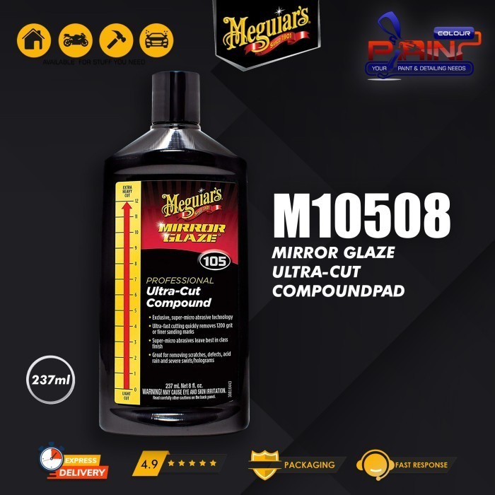 Meguiars M10508 Mirror Glaze Ultra Cut Compound diformulasikan dengan teknologi abrasif super-mikro eksklusif untuk menghilangkan cacat di bawah permukaan seperti goresan, acid rain, swirl parah dan hologram, hingga 1200 grit sanding mark.