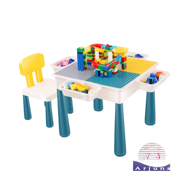 Meja belajar anak 3in1 multifungsi Kaki pada bagian bawah meja sudah terdapat spon anti slip, sehingga tidak mudah tergeser. Pada bagian samping di lengkapi juga dengan wadah penyimpanan, untuk menyimpan dan menaruh barang untuk keperluan diatas meja. Penutup pada meja dapat dibuka dan digunakan untuk belajar dan bermain. Pada bagian bawah penutup/permukaan meja, dapat dibuka sebagai tempat penyimnpanan cukup luas. Dapat digunakan untuk menyimpan perlengkapan belajar ataupun mainan. Terdapat lego bricks yang dapat digunakan anak untuk melatih kreatifitas ketika menggunakan meja ini dalam posisi bermain.