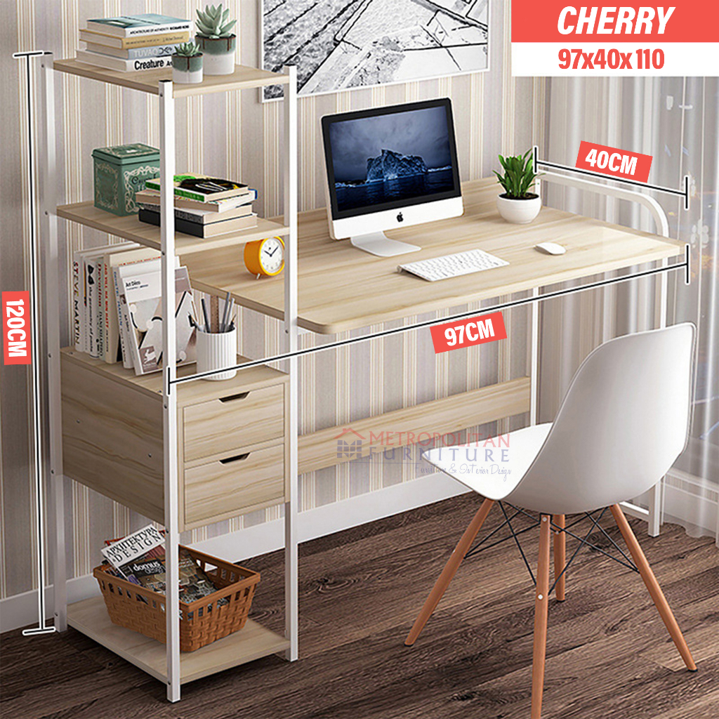 Fitur dan keuntungan: - Meja Kerja Menggunakan Material MDF dengan Rangka Besi - Fungsi penyimpanan yang beragam, dapat menempatkan buku / komputer / tanaman pot / gadgett, dll. - Ada juga fungsi penyimpanan di samping meja - Menambahkan desain pelat tarik untuk membuat keseluruhan meja lebih stabil dan menahan beban lebih baik