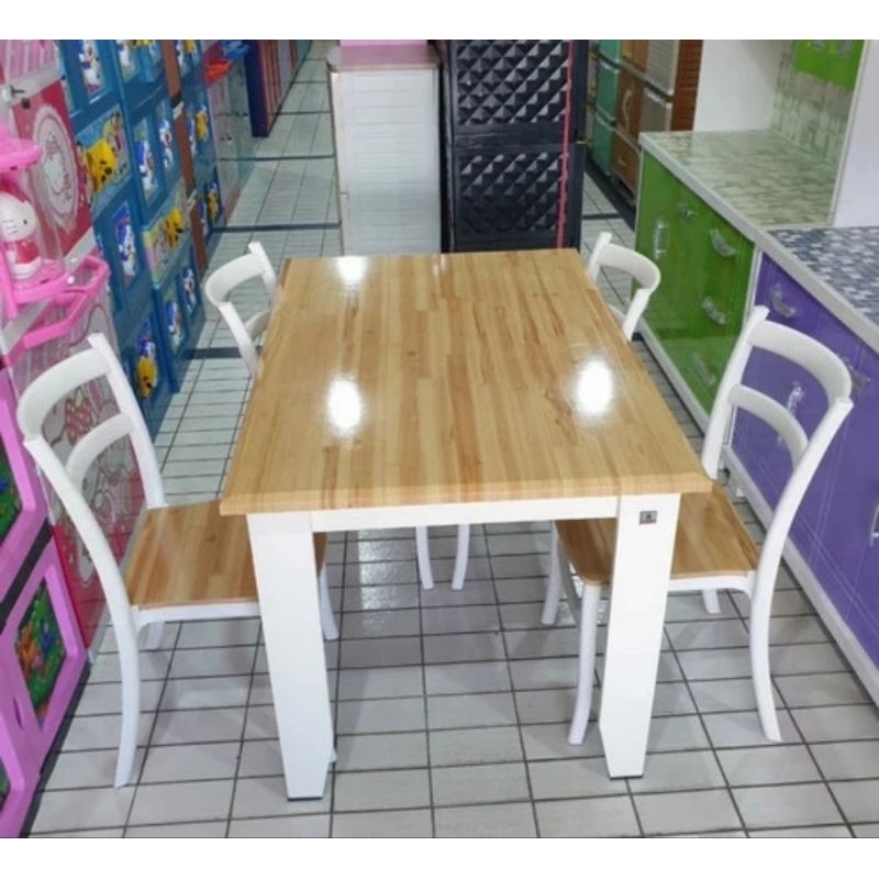 Meja makan 4 kursi bahan kursi - plastik, papan kursi MDF Kaki meja bahan mdf ukuran meja 1400x800x750mm ukuran kursi 360x360x840mm