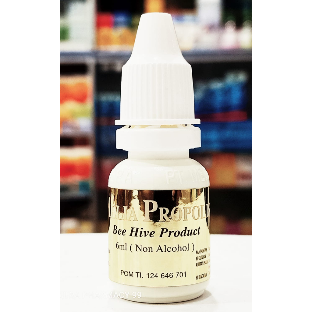 Hindari penggunaan wadah/alat yang terbuat dari logam. Dapat dikombinasikan dengan obat-obatan dokter, namun penggunaannya diberi jeda 1 jam sebelum atau sesudahnya. Efek Samping Mulut dan tenggorokan terasa kering, dan kulit terasa hangat setelah diolesi propolis Segmentasi Herbal Kemasan Botol, @ 6 ml Manufaktur None No. Registrasi BPOM: TI064621021