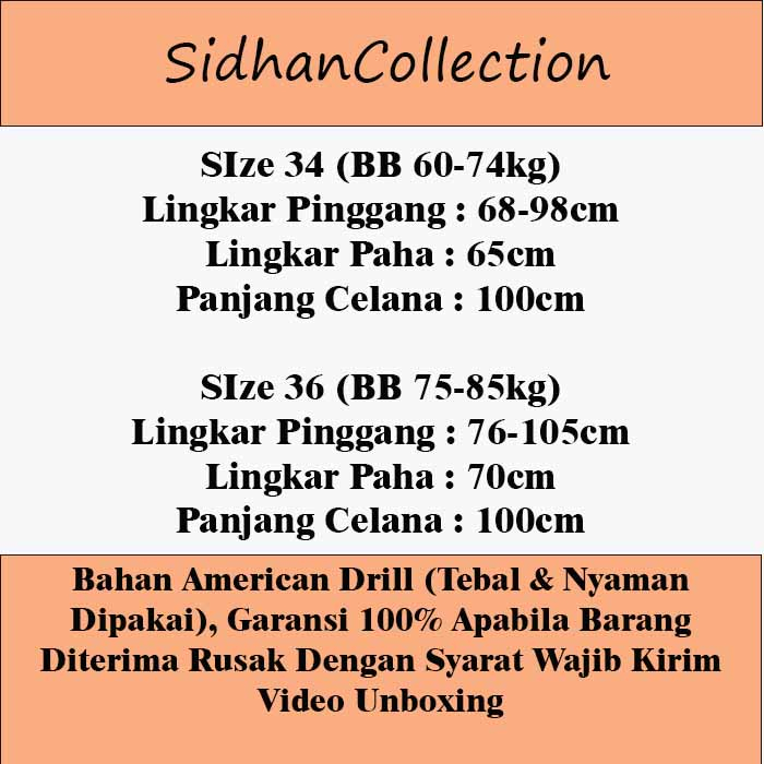 =>Size 36 (BB 75-85KG) >Lingkar Pinggang 76-105CM (Pinggang Belakang Pakai Karet) >Lingkar Paha 70cm >Panjang Celana100cm > (Direkomendasikan Tinggi Badan >160cm karena Panjang Celana 100cm)