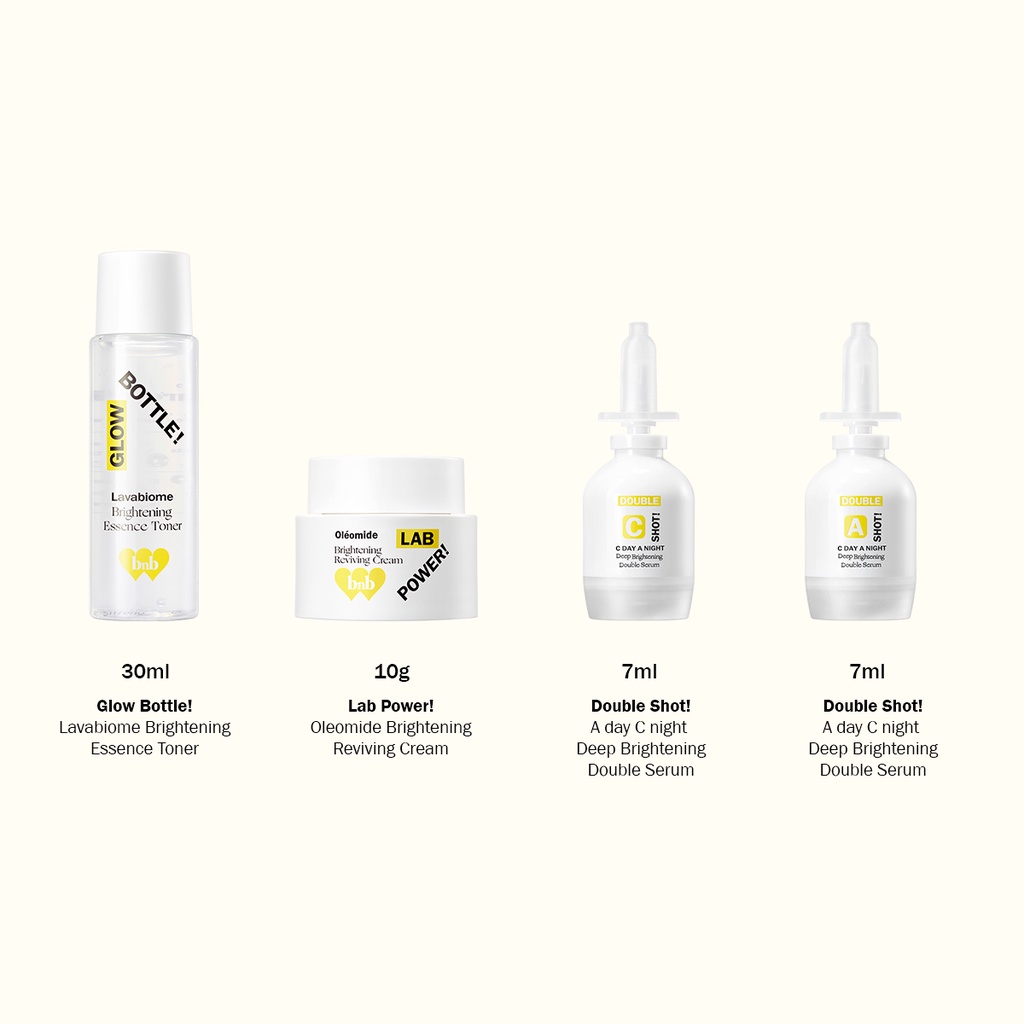 ❤ BNB barenbliss Meta-Glow Series Set Travel Kit Berisi : - 1 pcs Meta-Glow Glow Bottle! Lavabiome Brightening Essence Toner - 30ml - 1 pcs Meta-Glow Double shot! C Day Deep Brightening Serum - 7ml - 1 pcs Meta-Glow Double shot! A Night Deep Brightening Serum - 7ml - 1 pcs Meta-Glow Lab Power! Oléomide Brightening Moisturizer - 10g