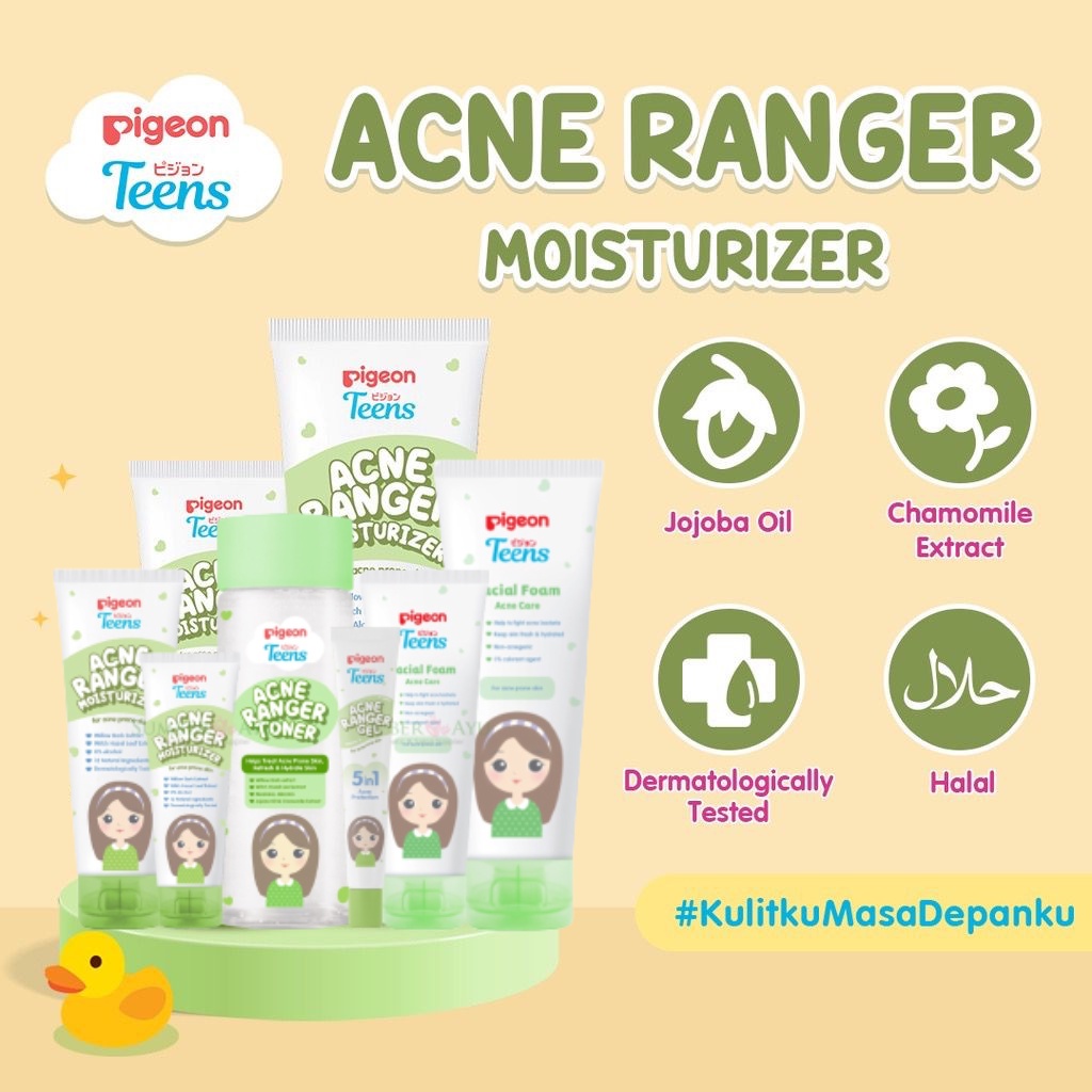 PIGEON Teens Acne Ranger Moisturizer adalah pelembap dengan tekstur ringan, mudah meresap, tidak berminyak, serta diformulasikan khusus untuk kulit remaja. Diperkaya dengan :