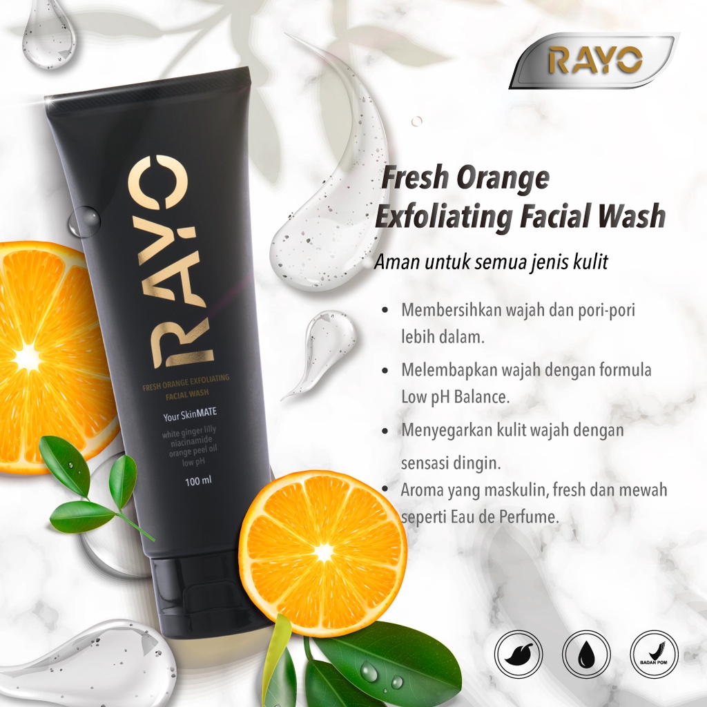RAYO FRESH ORANGE EXFOLIATING FACIAL WASH Dengan formula low pH balance sehingga kulit dibersihkan secara sempurna tanpa sensasi kulit kering dan ketarik-tarik.Tekstur gel bening dengan butiran scrubs charcoal yang lembut dikulit namun mampu mengangkat debu, kotoran dan keringat dengan tuntas,
