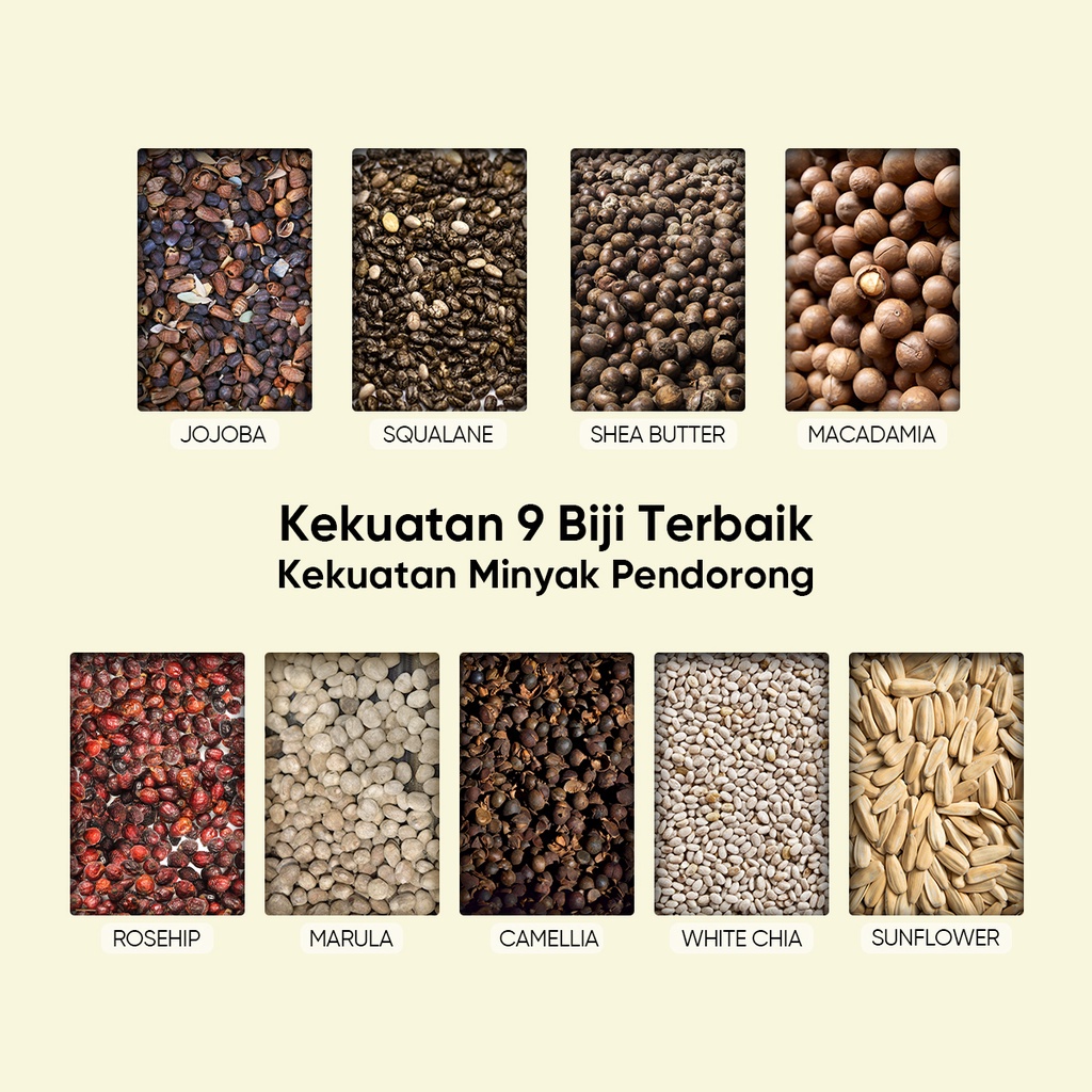 Facial Oil yang menggabungkan 9 jenis natural oil Jojoba, Squalane, Shea Butter, Macadamia, Rose Hip, Sunflower Seed, Marula, Camelia, dan White Chia Seed, untuk mengatasi permasalahan kulit kering, bertekstur dan kemerahan. Dengan tekstur yang ringan, Facial Oil ini menghidrasi, melembutkan, dan menenangkan kulit, untuk perbaikan skin barrier secara intensif dan mendalam. Dapat digunakan langsung, ataupun dicampurkan pada skincare lain untuk mendorong hasil yang optimal.