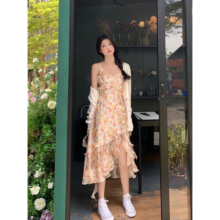 Detail Merah Muda PerancisvGaun Wanita Sifon Motif Bunga, Gaun Rompi Musim Panas Tidak Beraturan Tanpa Leng