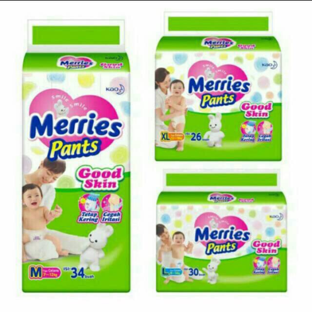 1. Berdaya Serap Tinggi Tidak mudah bocor dan dapat menampung hingga 5 gelas cairan S: 1 gelas=30 ml M: 1 gelas=40 ml L: 1 gelas=50 ml XL: 1 gelas= 60 ml 2. Berbahan Lembut Lapisan popok berkualitas selembut katun dengan bantalan empuk bersikulasi udara. Merries menggunakan bahan berkualitas sehingga memberi kelembutan baik di lapisan luar maupun dalam 3. Mencegah Iritasi Lapisan lembut dan sirkulasi udara yang baik membuat bagian dalam tetap kering sehingga menghindarkan bayi dari iritasi. 4. Tidak meninggalkan bekas Karet pinggang yang elastis tanpa menggunakan lem hot melt tidak meninggalkan bekas pada pinggang bayi 5. Cairan menyebar sehingga popok tidak menggelembung 3 garis pada bagian bawah popok merupakan teknologi baru yang berfungsi untuk meyebarkan cairan sehingga cairan tidak berkumpul di 1 titik dan tidak menggelembung. 6. Gather di sisi kiri dan kanan produk Lapisan tambahan pencegah bocor samping di kedua sisi popok (daerah dekat bokong bayi) yang mencegah iritasi dan membuat tampilan Merries Good Skin lebih baik