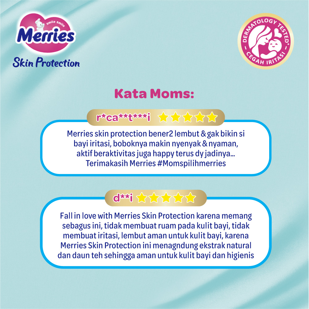 Merries Skin Protection merupakan popok premium multi proteksi dengan lapisan antibakteri yang mengandung ekstrak teh. Merries diproduksi dengan teknologi Jepang menghasilkan Teknologi +Anti Bau mencegah bau popok bahkan setelah terisi. Popok Sekali pakai (atau yang sering disebut pempers atau pempes) Merries Skin Protection sudah Teruji Klinis dan Allergy Tested, Cegah iritasi, ruam, gatal dan alergi pada kulit bayi. Perlindungan ekstra untuk menjaga kulit bayi yang sehat.