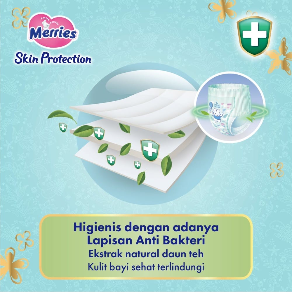 Merries Skin Protection merupakan popok pertama di Indonesia dengan kandungan ekstrak teh alami, popok lebih higienis di Kulit Bayi. Dengan Technology Hygiene Protect, popok higienis dengan adanya lapisan antibakteri. Popok Sekali pakai (atau yang sering disebut pempers atau pempes) yang Teruji klinis Cegah iritasi, ruam dan gatal untuk kulit bayi yang sehat terlindungi. Perlindungan ekstra untuk menjaga kulit bayi yang sehat.