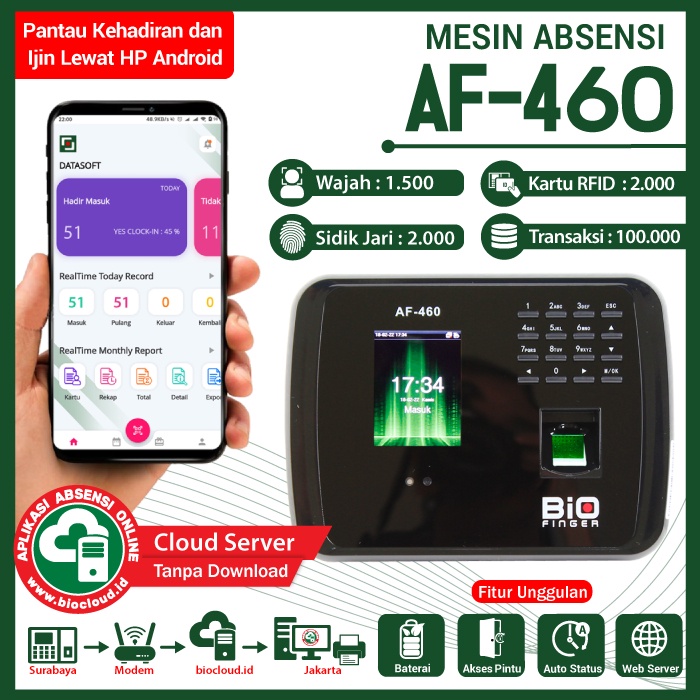 Detail Mesin Absensi Wajah BioFinger AF-460, LAN, Cloud, Notif WA, OnLine, HP