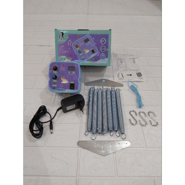 Kelengkapan produk sbb : 1 mesin ayunan dengan fitur sbb : - Musik, - Timer 60 s/d 240 menit, - Speed / Stel kecepatan 1 Adaptor, konsumsi daya hanya 12W. 7 pegas 5 s/d 17.5kg 2/3 Pengait S. 2 tali (buat cadangan)
