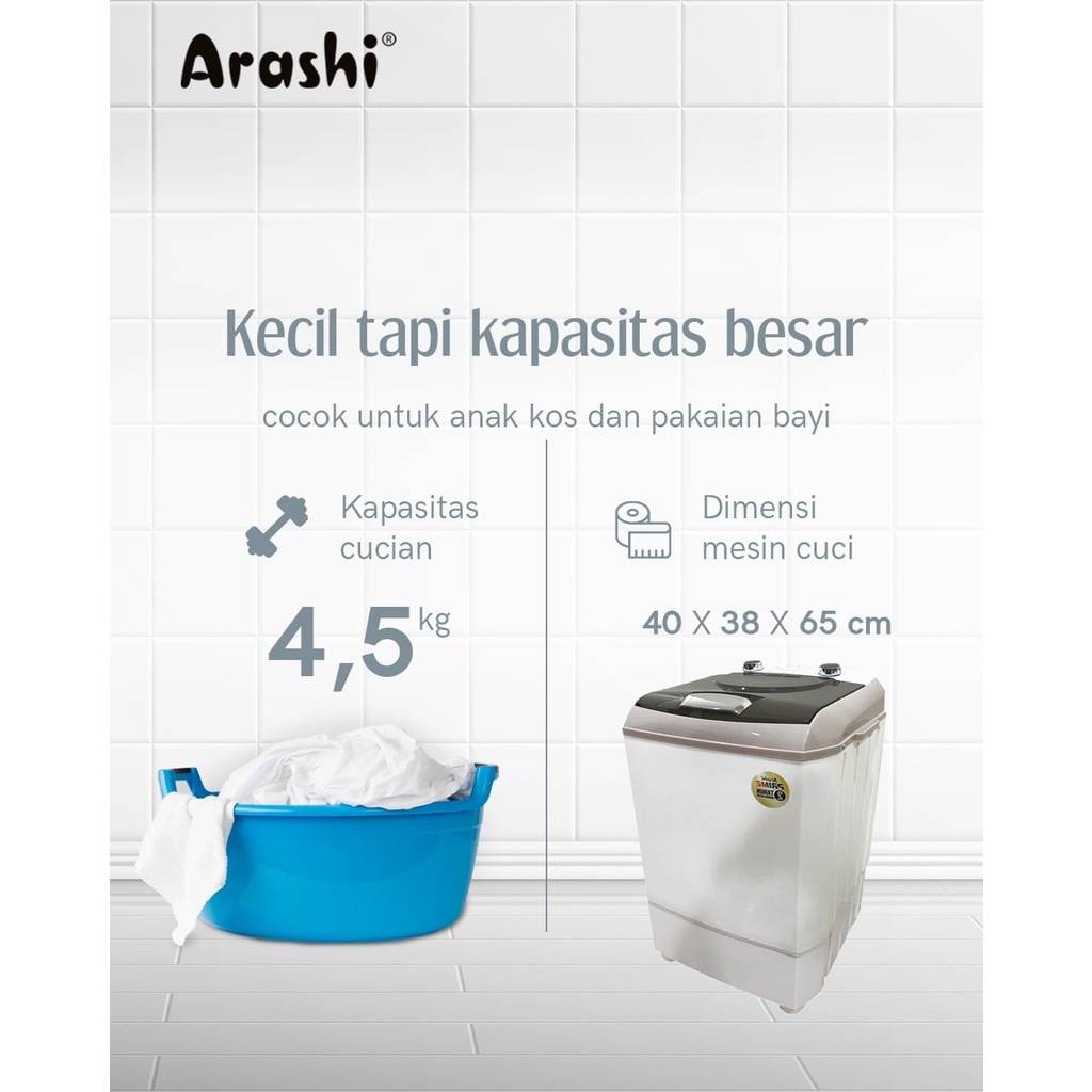 Detail Mesin Cuci Portabel Arashi AWM 452A Free Packing Kayu - Garansi Resmi 2 Tahun