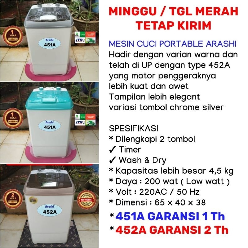 Spesifikasi ARASHI * Dilengkapi 2 tombol pengaturan ✓ Timer ✓ Mode Dry + Wash * Kapasitas : 4.5 Kg * Daya rendah : 200 watt * Dimensi : 65 x 40 x 38 ✓ Suaranya HALUS 👍 ✓ Lebih awet dan tahan lama ✓ Kapasitas cuci : ± 8 ptg s.d ± 10 ptg ( Tergantung besar - kecilnya cucian ) ✓ Bahan tebal dan berkwalitas, kuat elegan