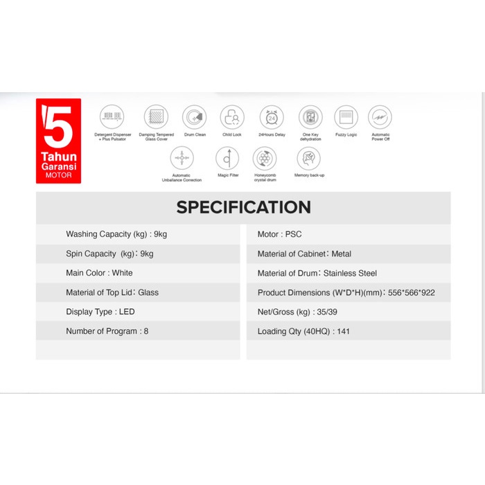 Fitur: Detergent Dispenser + Plus Pulsator Damping Tampered Glass Cover Drum Clean Child Lock 24 Hours Delay One key Dehydration Fuzzy Logic Automatic Power Off Automatic Unbalance Condition Magic Filter Honeycomb Crystal Drum Memory Backup