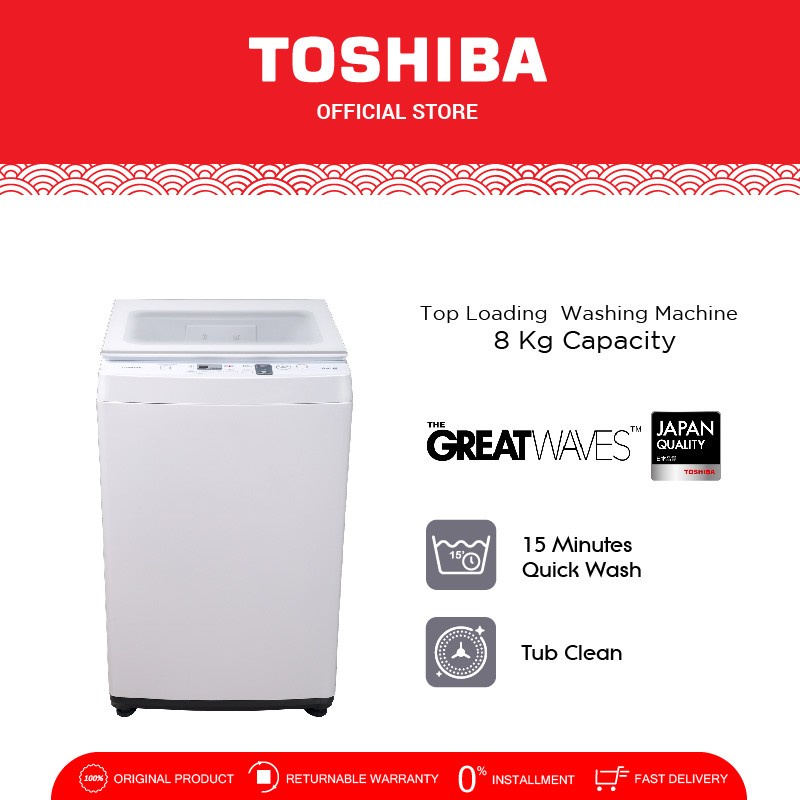 Brand: TOSHIBA Model: AW-J900DN (T06) Tipe: Top Loading/Bukaan Atas Tabung: 1 Kapasitas: 8kg Power (Daya): 220 Watt Maximum Power: 400 Watt Voltage: 230 - 240V Frequency: 50 Hz The Greatwaves Japan Quality Quick 15"" Tub Clean LED Display Panel Stainless Steel Drum Dimensi paket : 630x635x1030 (mm) Garansi 3 tahun Motor, 1 tahun Jasa & Spareparts