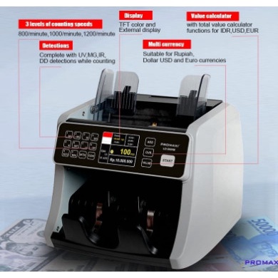 Fitur : - Perhitungan Model Top Loading/Uang taruh atas - Bisa Menghitung Mata Uang ( IDR - USD - EURO - ) Dan Bisa Tampil Logo Bendera Sesuai Negara nya Masing-Masing. - Memiliki 3 mode kecepatan sampai 800, 1000 dan 1200 lembar per menit - Fungsi Kalkulator/Menjumlahkan Jumlah lembar uang dalam 1 pecahan. Contoh : 20.000 x 100 lembar hasilny 2.000.000 - Layar Utama yang besar/3 Inch - Tersedia 2 LAYAR DALAM 1 MESIN : LAYAR 1 TERLETAK DIDEPAN DAN LAYAR KE 2NY TERLETAK DISAMPING DAN MENDAPAT EXTRA LAYAR EXTERNAL.