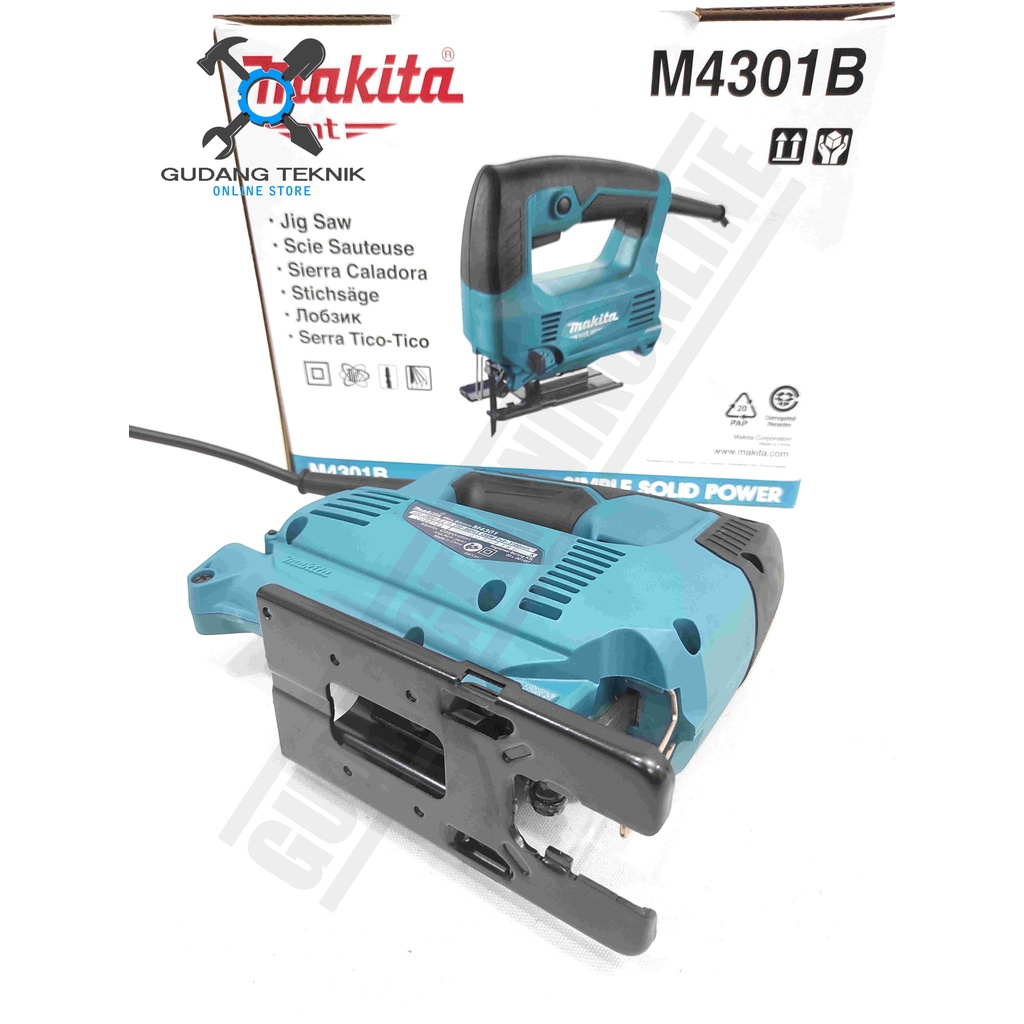 ** M4301B MAKITA Merk : MAKITA Tipe : M4301B Voltase : 220 V / 50 Hz Daya Listrik : 450 Watt Jenis Mata : T Shank Kapasitas Potong Kayu : 65 mm Kapasitas Potong Besi : 6 mm Panjang Gerakan Potong : 18 mm Gerakan Potong : 0 - 3100 per menit